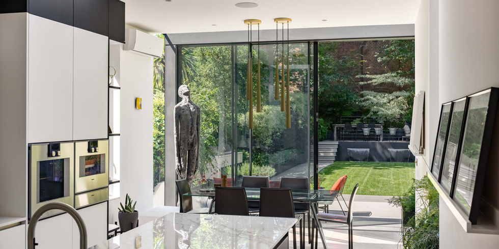 The entrance hall is a triumph of proportion and design, offering a clear, uninterrupted vista through to the rear garden. High ceilings, a bespoke staircase with suspended spindles, and chevron wood flooring together create an immediate sense of light and space. Black-framed accents, used consistently throughout, reinforces the property’s restrained modern aesthetic while respecting its architectural heritage.