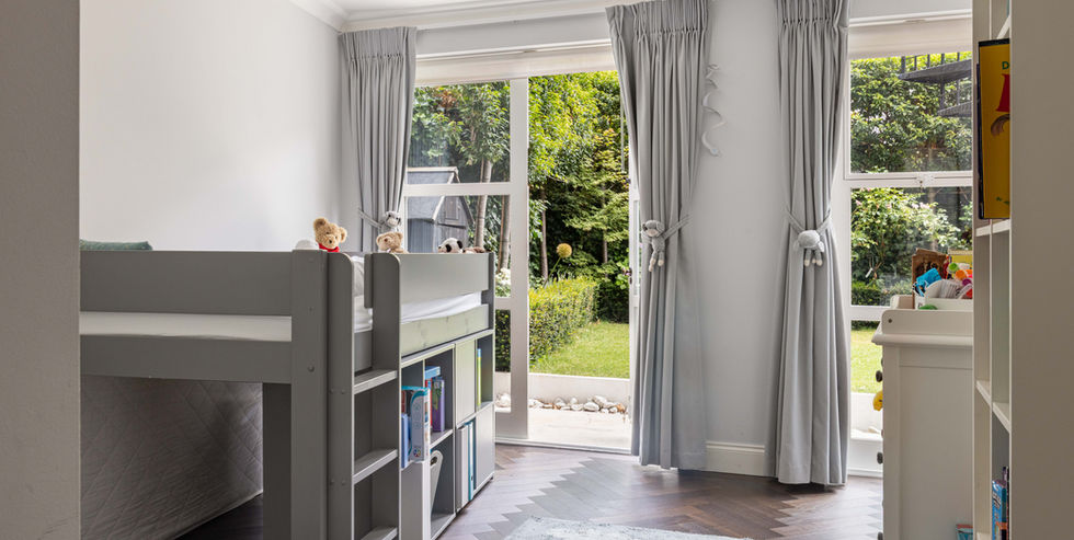 On the lower ground floor, the principal bedroom suite opens directly onto the garden and features a generous walk-in wardrobe and en-suite bathroom. Two further bedrooms enjoy garden views, with one also offering an en-suite bathroom, while the fourth bedroom is currently configured as a gym. A guest WC and ample built-in storage complete the home.