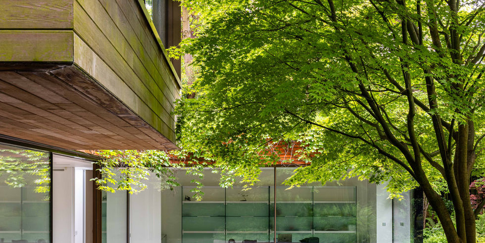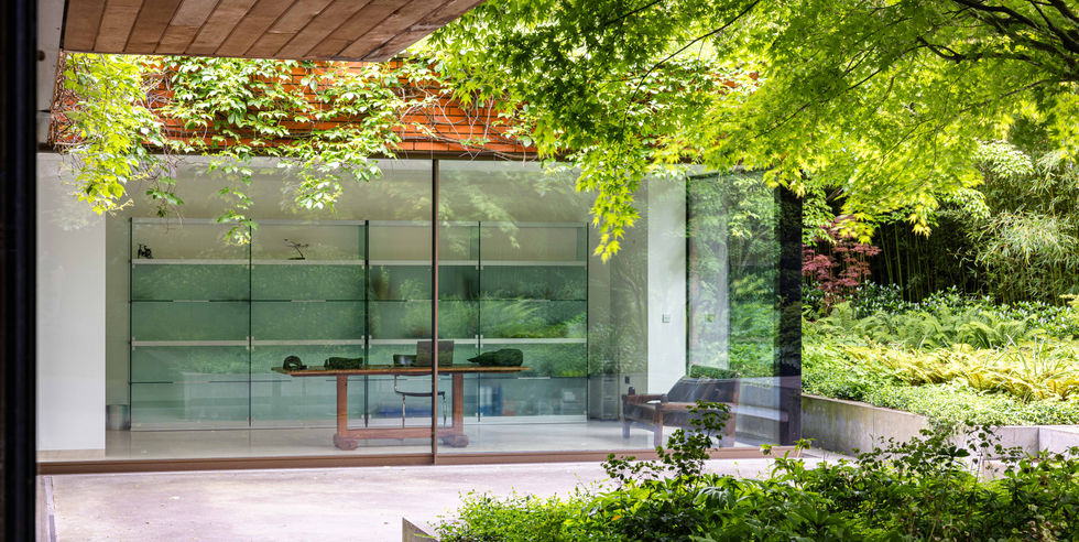 It is well known that being in nature calms the nervous system, extends life, and boosts creativity, but it can be cold and wet. This is not the case in The Glass House, which merges 21st-century design with floor-to-ceiling windows offering panoramic views of the mature woodland garden featured in Gardens Illustrated and Design Outdoors by Matt Keightley. It feels like living among the trees but in the warmest, safest, and most private house possible.