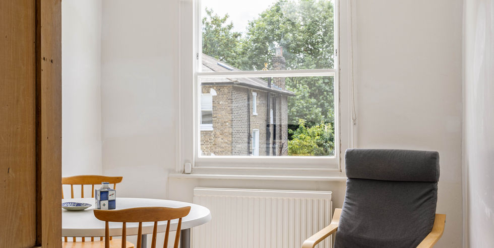 The entrance to the lower ground floor flat is at the bottom of the entrance steps. The garden flat has two bedrooms, a kitchen, and a reception. The self-contained unit offers buyers the choice to keep it separate as an income-generating rental (while retaining garden access for the upper maisonette via the existing exterior staircase), or to combine it with the upper floors and extend the lower ground floor to utilize the full 3,414 sq ft of space, with further potential to extend upwards or into the garden subject to planning permission.